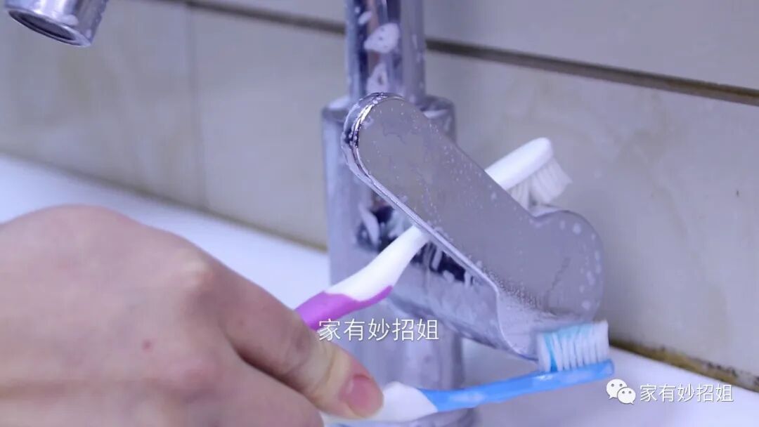 我们可以用它来清洁水龙头上面的水渍。我们家里的水龙头用的时间长了,上面就会有很多的水垢。我们把两个牙刷掰开,将水龙头卡在两个牙刷中间,这样来刷洗就能将水龙头缝隙里面的污渍全部都刷洗掉了,水龙头就会被清洁的很干净。