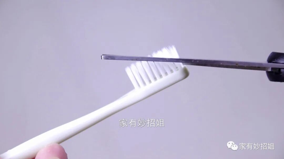 妙用一:我们先拿一把旧牙刷,然后用剪刀将牙刷顶部的刷毛,斜着稍微给它剪掉一半,剪好就可以了。