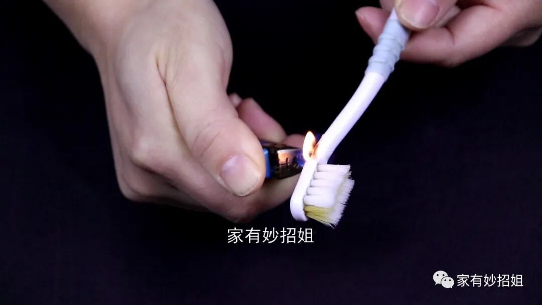 妙用三:我们先拿一个打火机,把牙刷背面刷毛下方一点的位置,用打火机烫一烫,等牙刷稍微烫软的时候,我们再将牙刷向外掰成90度,然后握着不动,等牙刷冷却定型就可以了。