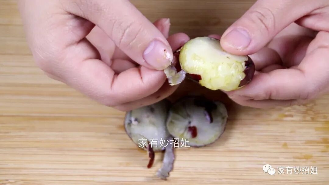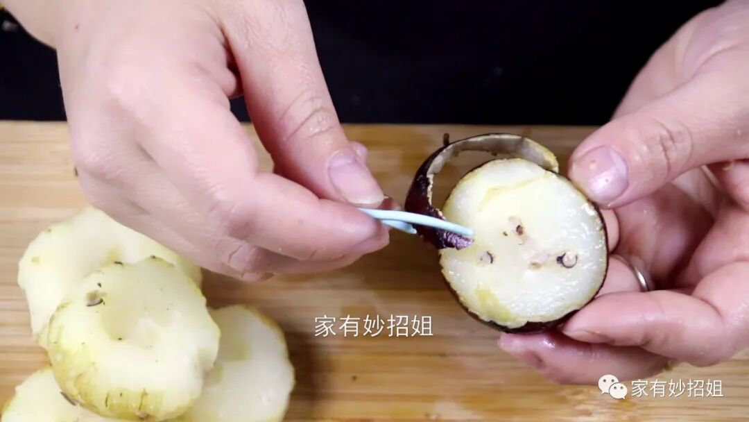 虽然用指甲也能轻松抠下来,但抠上一两个还好,如果多抠上几个,指甲的缝隙里面就会卡满马蹄皮。这个时候我们就可以拿上一根牙线,用牙线的部分在马蹄皮表面的位置轻轻一划,这样一划就划掉了一大片皮。