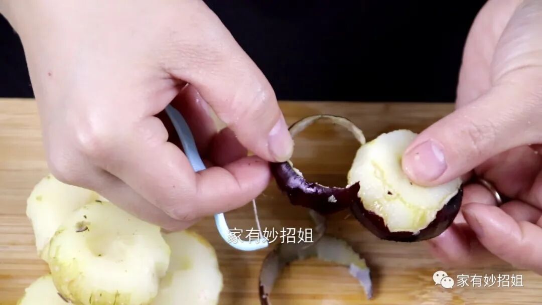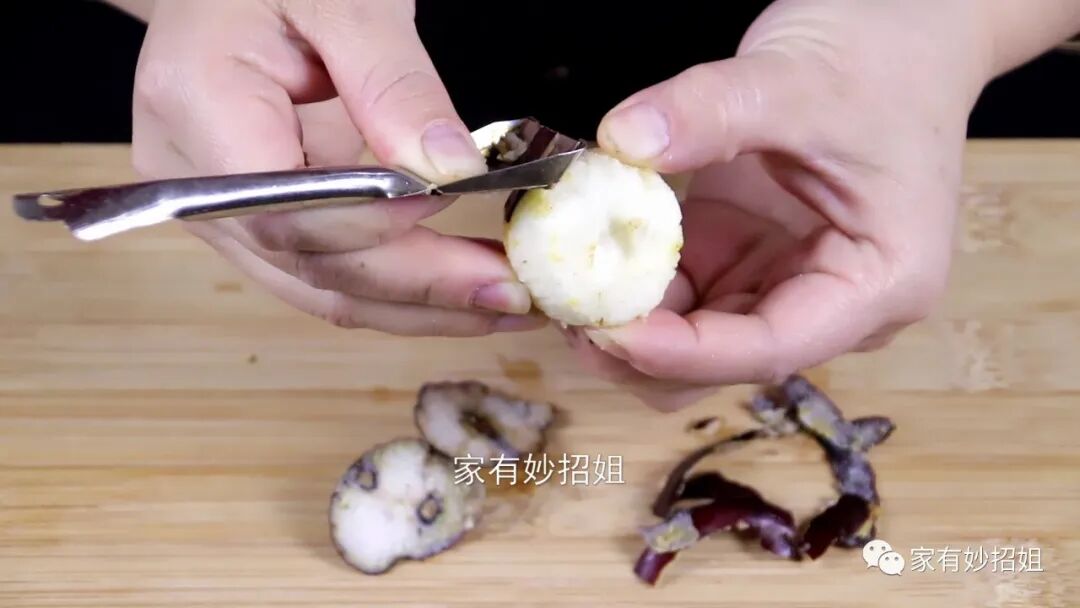 接下来,我们再拿一个削皮器,用削皮器来削马蹄中间的一圈皮,这样轻轻松松的就把一整个马蹄削好了,方法简单快速,而且也不会造成果肉浪费。