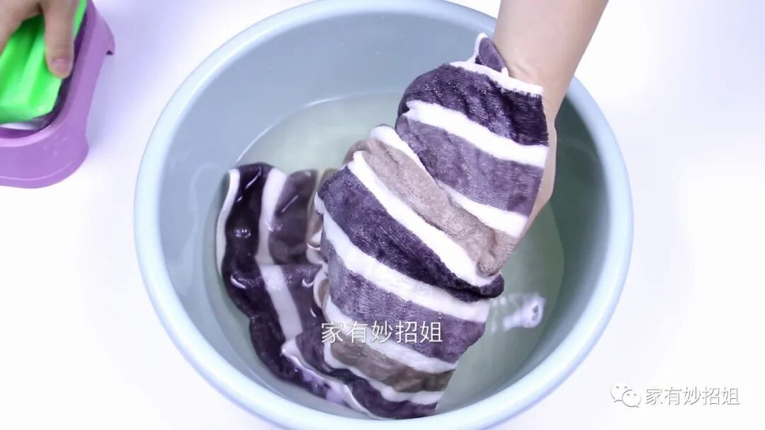 最后我们只需要换一盆清水,将毛巾上的食用碱和食盐残留漂洗干净,我们的毛巾就清洗好了。