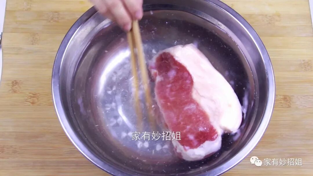 浸泡的时间差不多了,我们将猪肉拿起来,就可以发现,猪肉已经被解冻变软,摸上去再也不是硬邦邦的了。短短的十分钟,我们可以准备一些炒菜时的其他食材,然后就可以来切这个猪肉了,一点也不耽误时间。