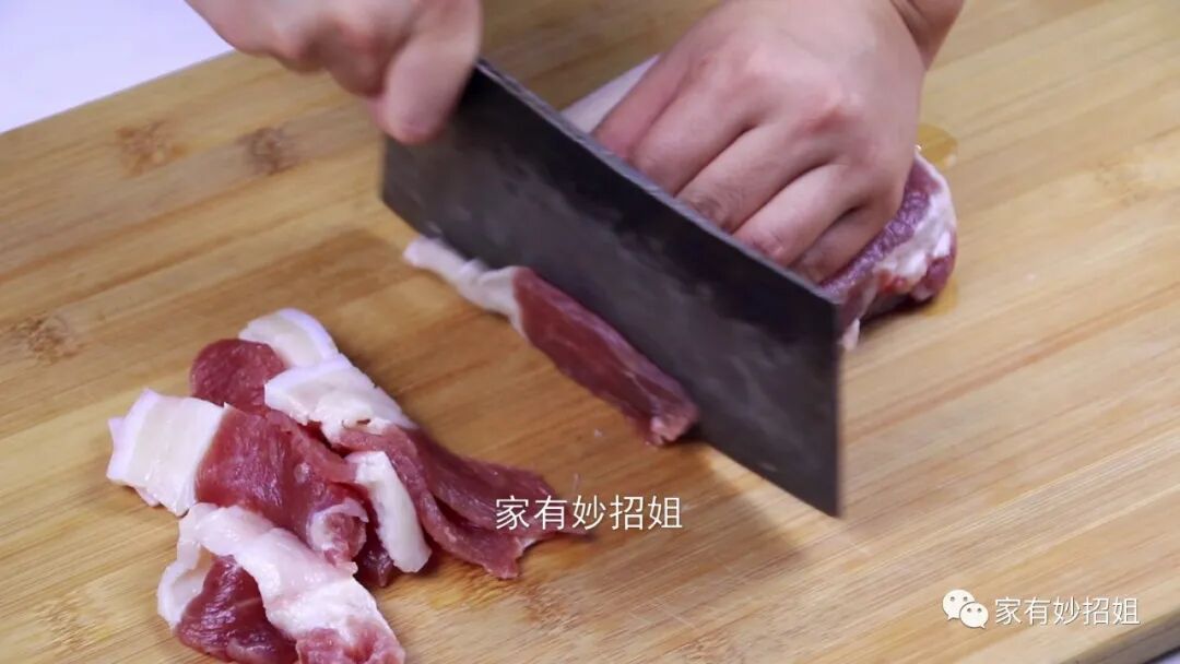 猪肉被解冻好,我们只需要按照自己的需求,将猪肉切成片或切成丝。在切的过程中,可能肉中间的部分会有一点硬心的情况,其实这个也是完全不影响的,反而会比完全解冻的肉更好切一些。猪肉完全解冻就会软趴趴的,然而有点硬心的话,我们切起来会更好控制切的薄厚。