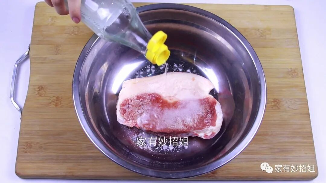 接着,我们再往上面倒上一点白醋,白醋不仅可以起到一个软化的作用,而且白醋还能去除肉腥味。