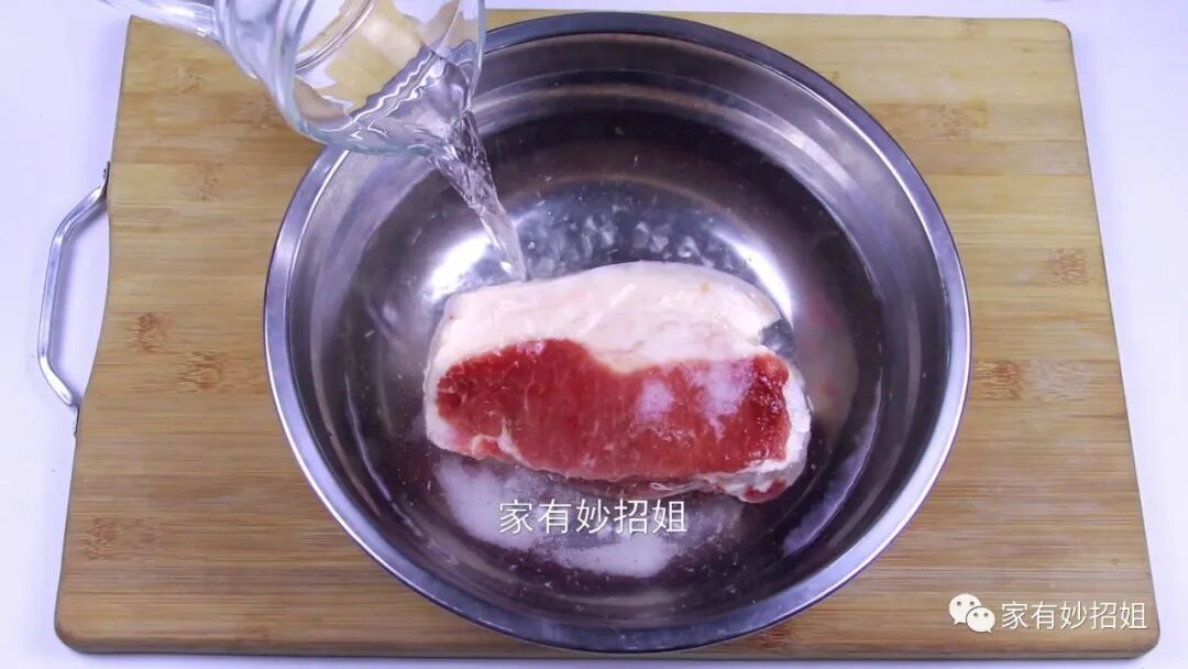 接下来,我们再往盆里倒入清水,水可以稍微多倒一点,要将猪肉完全浸泡在水中。很多朋友想猪肉能快速解冻,就会用上热水,甚至是放进锅里煮,虽然这样也可以加速猪肉的解冻,但热水解冻会使猪肉变柴,所以我们解冻猪肉用冷水就可以了。