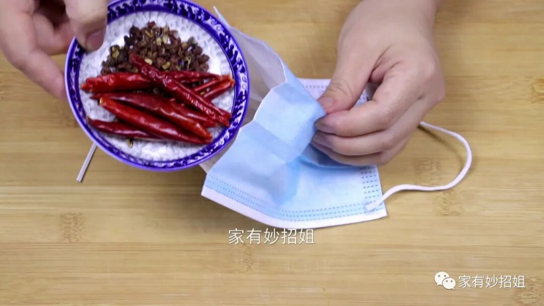 方法也很简单,我们只需要拿上一个一次性的口罩,将口罩的一端剪开,然后在口罩里放入一些花椒和干辣椒,接着再用口罩的挂耳绳将它扎紧,这样一个预防大米生虫的香包就制作好了。