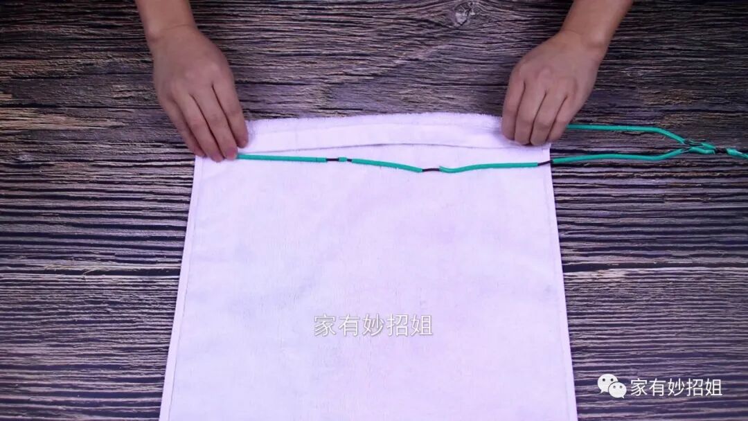 接下来,我们再将长丝袜的一个袜腿剪下来,用一个袜腿将毛巾和衣架都套在里面,顶部打结固定好,这样一个清洁头发的神器就制作好了。