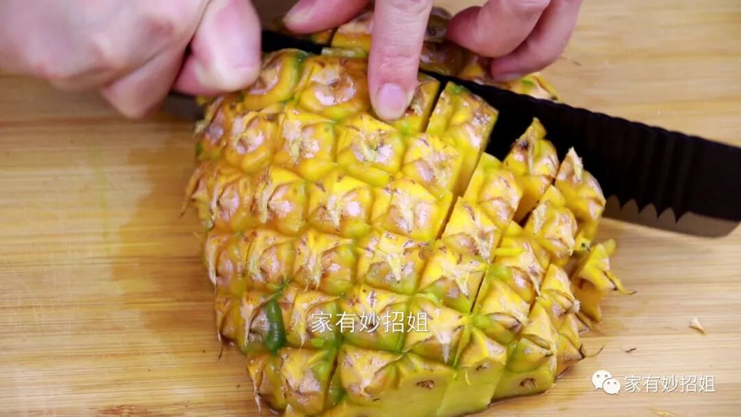 我们先把这半个菠萝倒扣在案板上,注意观察我们可以发现,菠萝的外皮是有纹路的,接下来,我们只需要用刀顺着菠萝的纹路将它切开来。
