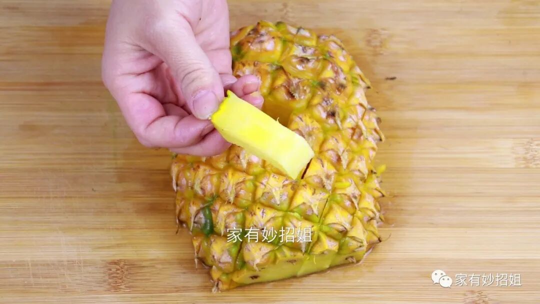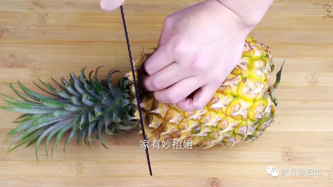 我们可以稍微把果皮切厚一点,因为菠萝的皮中间部分,会有一点小刺。皮稍微切厚一点,就能将这层小刺给切掉了。