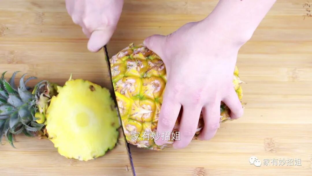 菠萝头尾切掉后,把菠萝从中间对半切开,我们先来切一半的菠萝,另外一半菠萝放在一边备用。