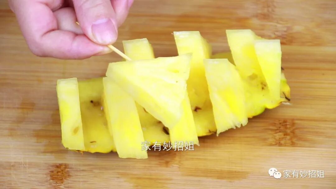 切好后再将果肉交叉的摆放好,插上牙签就可以直接开吃了,这个方法也非常的快速、方便。