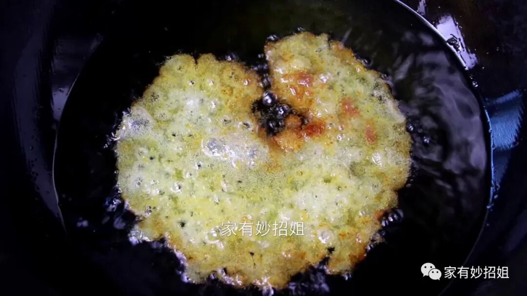 大概让它炸上一两分钟的样子,刚刚的淀粉水就都凝结在了一起,变成了一个淀粉饼,还会慢慢的漂浮到油面上,这个时候我们也不要急着将它捞出来,让它多在油锅中炸一会。