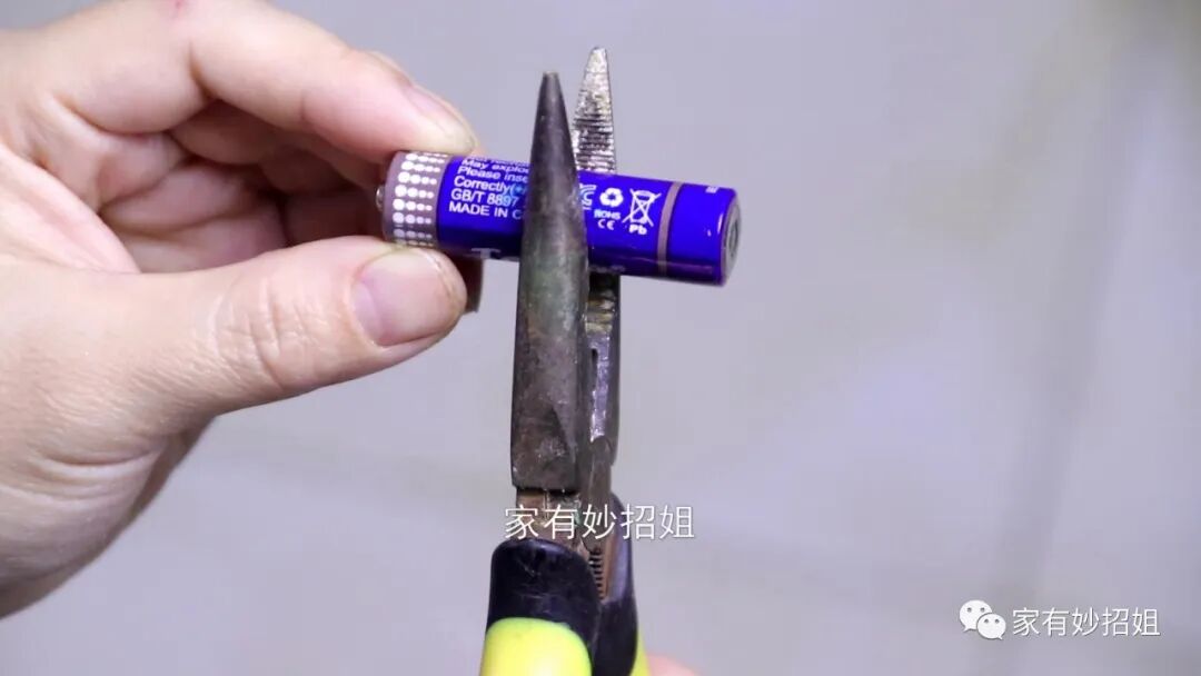 另外提醒大家,挤压电池千万不要去用牙齿咬,因为在电池里面存在很多的化学物质,而我们的牙齿也比较尖锐,在咬的过程中,很容易会把电池咬破,那样就不好了。家里面没有老虎钳的话,我们也可以用剪刀的尾部把它夹一夹,效果也是一样的。