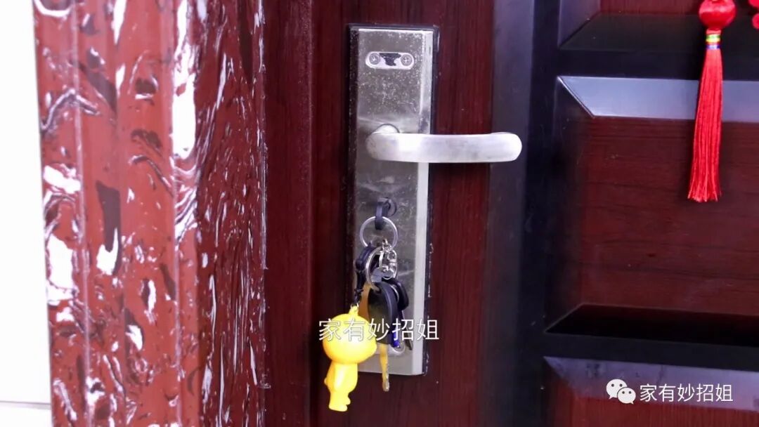 第四个方法:平时我们开门回家,这个钥匙我们从外面拔出来后,直接插进房间内的门锁里面,然后再转一圈,将门反锁,钥匙就不要拔出来了,让它插在门锁里面,这样非常的安全,如果有小偷想进我们家的话,钥匙孔被堵住,他就很难破锁进入。而且第二天我们出门上班时,钥匙没有拔出来,反锁没有解开的话,我们也是出不去的。那么这个时候,只有将反锁解开,然后把钥匙拔出来,门才能被打开,所以这样子我们的钥匙就不可能被忘记了。不仅可以保证我们的安全,还能够预防忘记带钥匙,非常简单实用的小窍门。