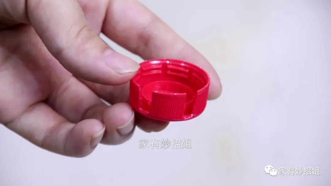 第三个方法:这个方法和挂钩的原理差不多,如果我们家里没有挂钩的话,我们也可以利用上一个塑料瓶盖,就是平时我们喝饮料拧下来的盖子就可以。我们先用记号笔在瓶盖的两边,画四条竖线,然后沿着竖线把它切割下来,这样就在瓶盖上有两个大凹槽,这两个凹槽的距离大概在一厘米的样子。