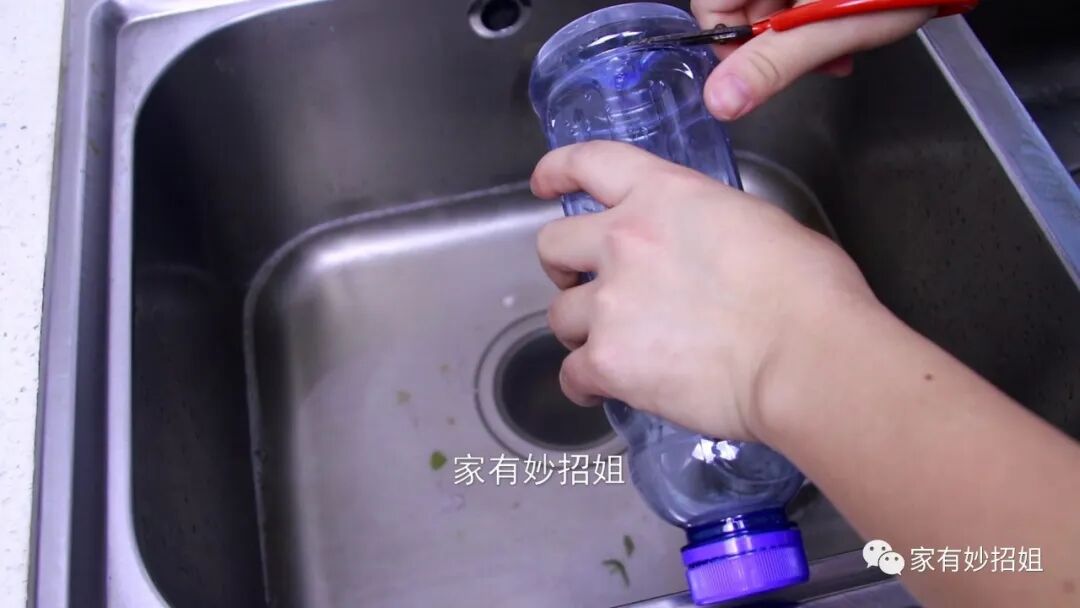 接着,我们在洗碗池里蓄上多一点的水,然后用手抓住瓶子的上半部分,把剪开的瓶底对准洗碗池的下水口。接下来,我们只需要将瓶子对准下水道口,不停的抽动几下。