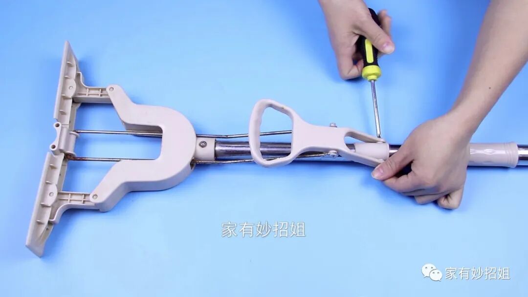 平常我们用来拖地的拖把款式有好几种,但不管是哪种款式的拖把,都是有一根长长的拖把杆的,我们只需要利用上这根拖把杆就可以了,在改造之前,我们需要先将它取下来。方法也很简单,就比如说我家的这个拖把,只需要用螺丝刀,先把拖把杆上的几个螺丝给它拧开,然后就可以将拖把杆完整的取下来了,拖把杆取下来后先放一边备用。