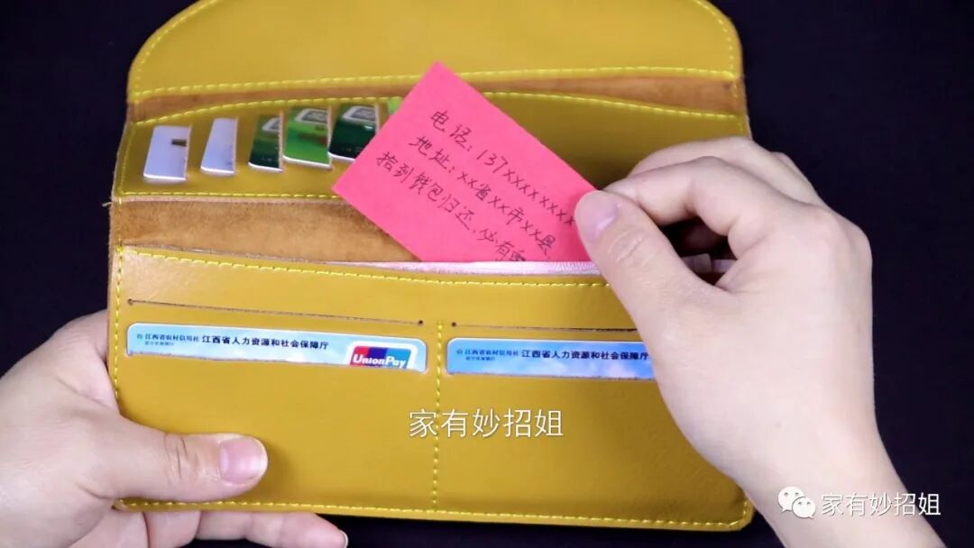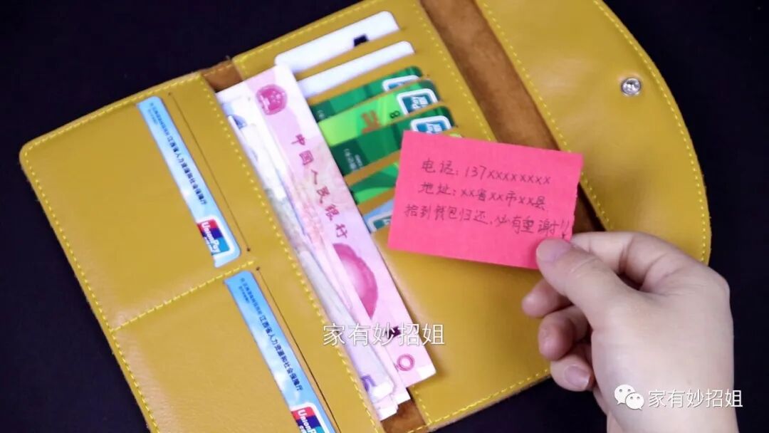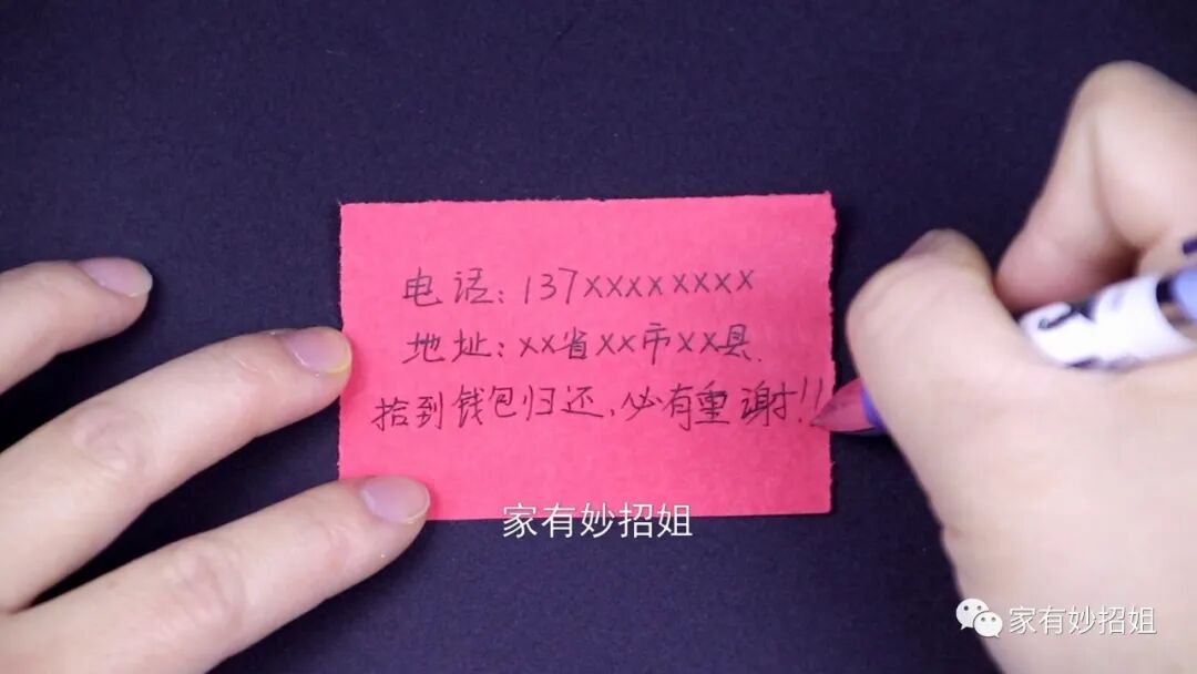 写好,我们再将这个纸条夹在钱包显眼的位置,一打开钱包就能看到的那种。一张这个小纸条也占不了钱包的位置,但它却能大大提升我们钱包找回的几率。我们的钱包一旦丢失,里面的钱不多,掉了没什么关系,而钱包里的任何一个证件补办起来都是很费时的,我们要相信世界上还是好人比较多的,所以说,我们在钱包里放上一张这样的纸条是非常有必要的。如果今天的文章对您有帮助,那就点一个关注,点一个赞,感谢您的支持。