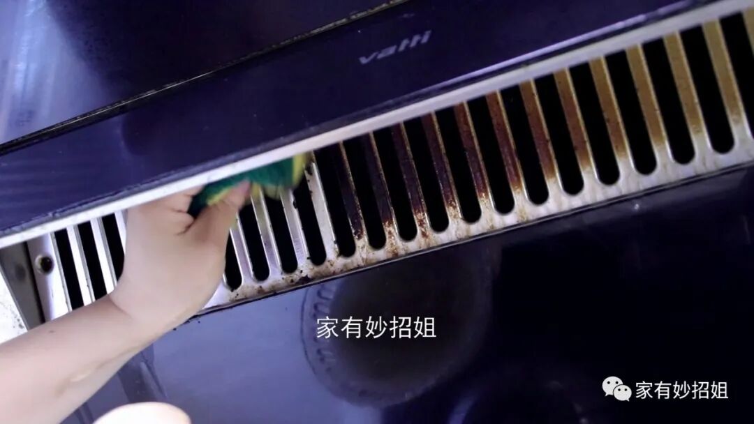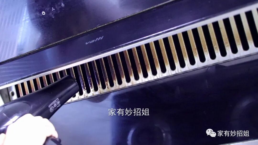 我们把油烟机的油污吹融化后,只需要用百洁布蘸取这个清洁溶液来擦拭,就能很轻松地将油烟机上的油污都擦拭干净了。