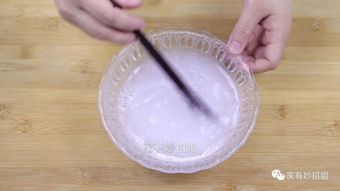 接着我们再调一个清洁的溶液,在碗里倒入一勺小苏打,再挤入一点洗洁精,然后倒入开水,搅拌一下,这样一个清洁溶液就做好了。