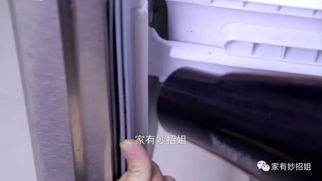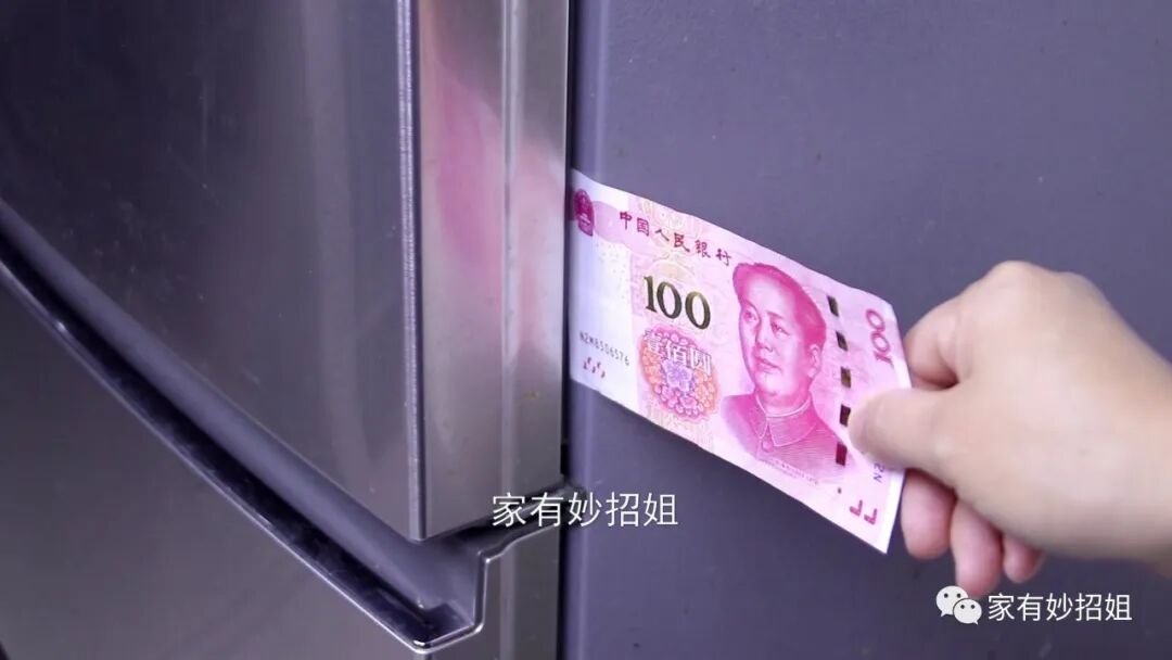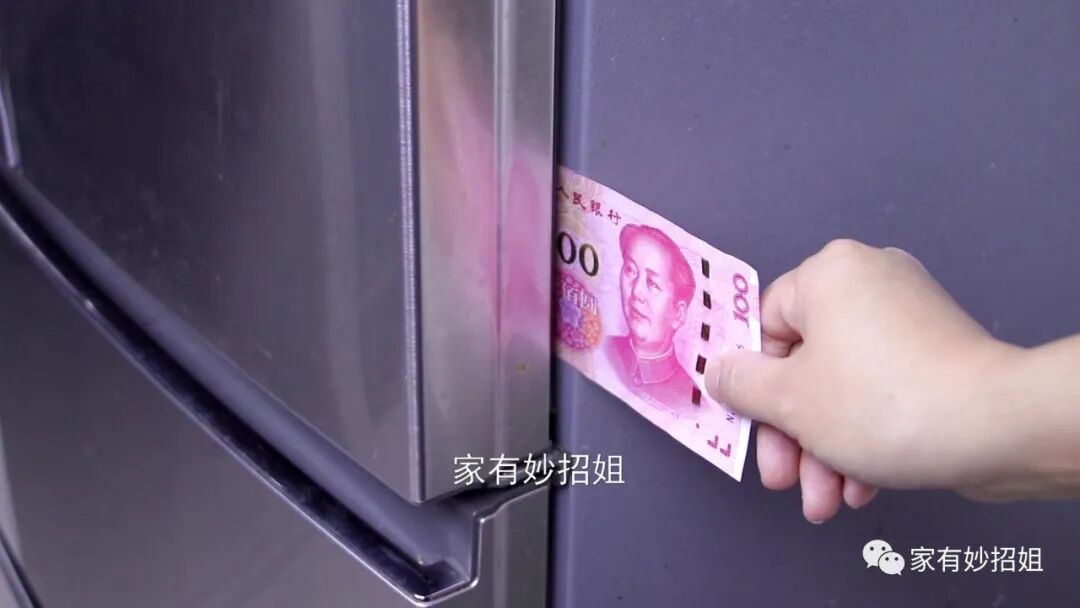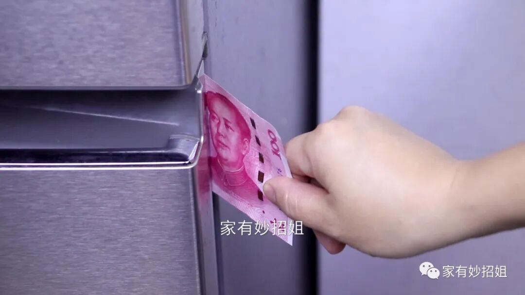 要检测这个密封条是否完好,我们就可以用上一张纸币。只需要把冰箱门打开,然后把人民币夹在冰箱门边的密封条处。