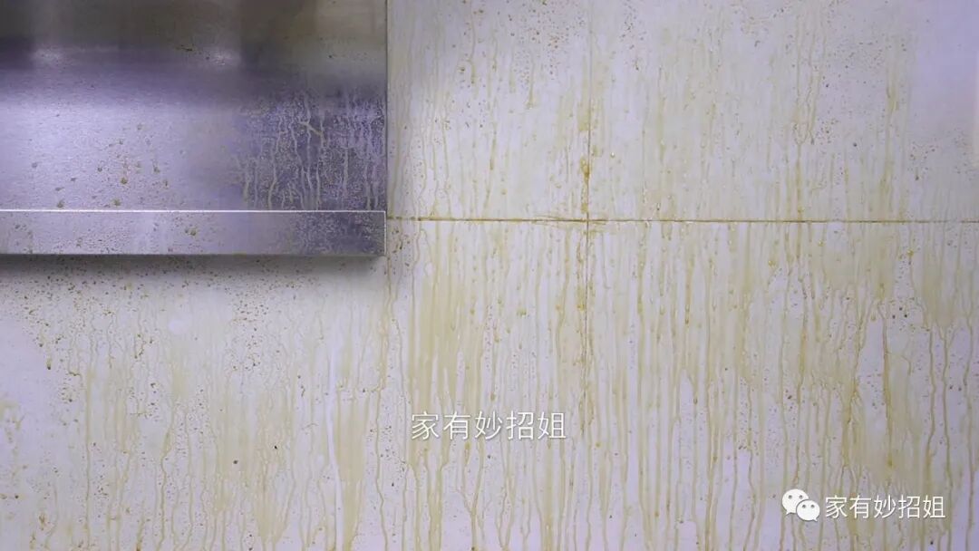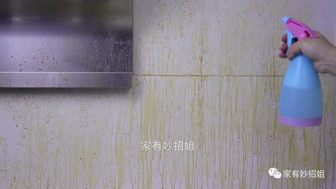 这个溶液不仅可以擦拭油烟机,我们也可以将它喷洒在有油污的墙壁上。
