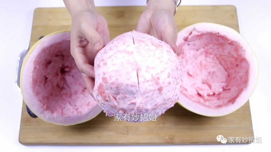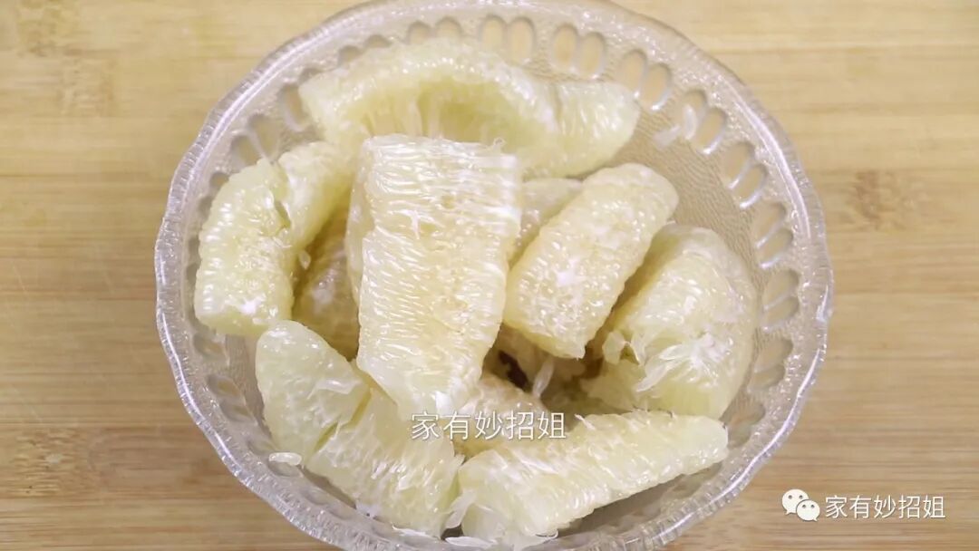 接着我们再将柚子的皮一点点剥去,将柚子肉一块一块地剥出来。