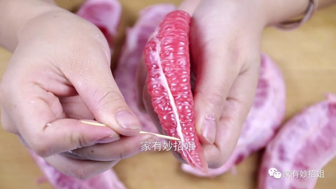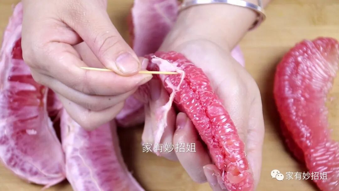 我们取其中一小半的柚子肉,把它的外皮剥掉。这个柚子内膜剥到后面的话,就会剩下柚子背部的一点筋膜没有办法去除,这些筋膜都是直接连着柚子肉的。那么这个时候我们就可以拿一个牙签,在筋膜的两边各划一圈。