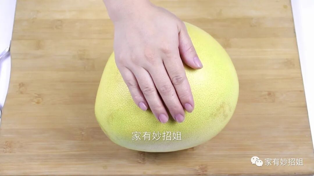 我们在剥柚子肉之前,需要将柚子的外皮剥掉,但是柚子的外皮剥起来也比较费力,其实我们可以把柚子先在案板上滚一滚。这样滚一滚,柚子皮就会被滚软,等一下我们在剥皮的时候就更容易一些。