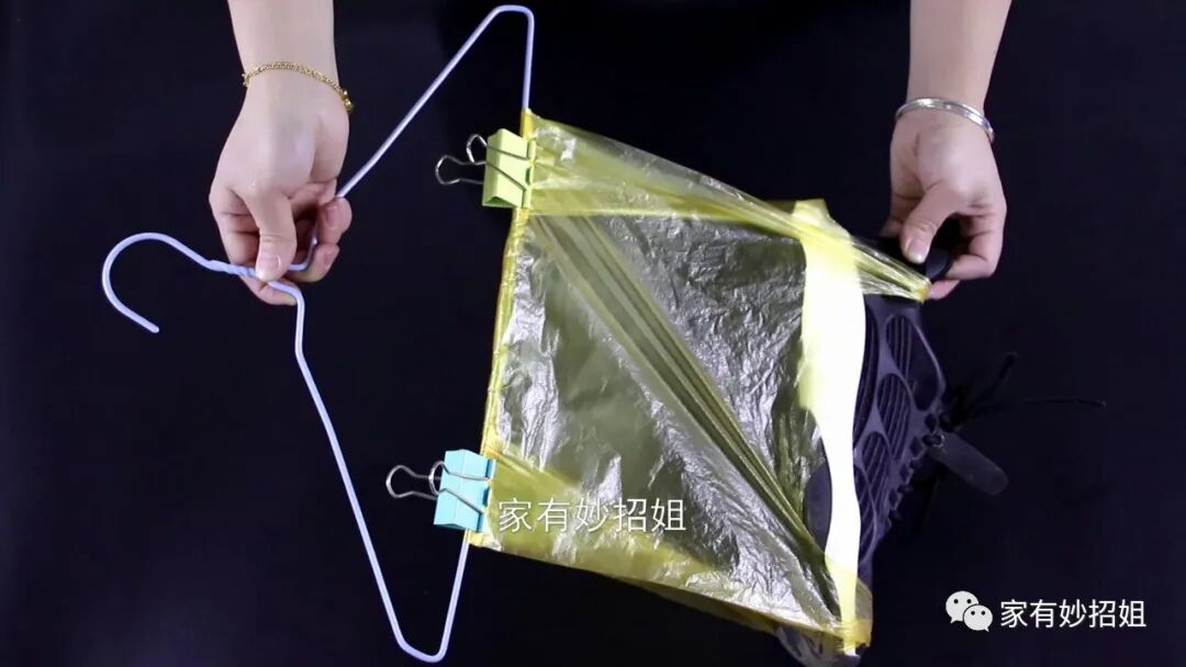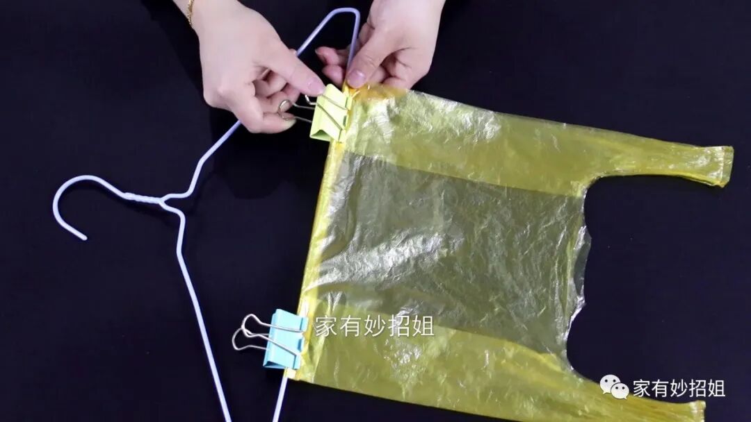 折叠好,我们再用燕尾夹夹在袋子的两边,把塑料袋固定在衣架上面,这样就完成了,塑料袋被牢牢的固定在衣架上了。