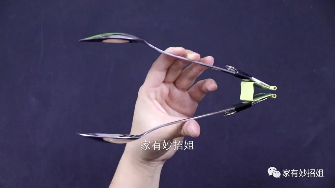 平常我们刚煮好的鸡蛋,或者刚蒸好的红薯、土豆之类的,都是非常烫的,想要将它从热锅中拿出来,就需要用到一个食品夹了。其实食品夹不用买,我们自己就能制作一个,方法很简单,我们先准备1个大的燕尾夹,和2个同样大的不锈钢勺子。先将其中的一把勺子插在燕尾夹一个把手的中间,勺子凹的一面朝里,然后用胶布给缠绕一下,胶布要多缠绕几圈,这样才更加牢固。一边处理好,我们将另一把勺子也按同样的方法,固定在燕尾夹的另一边把手上,这样一个食品夹子就制作完成了。