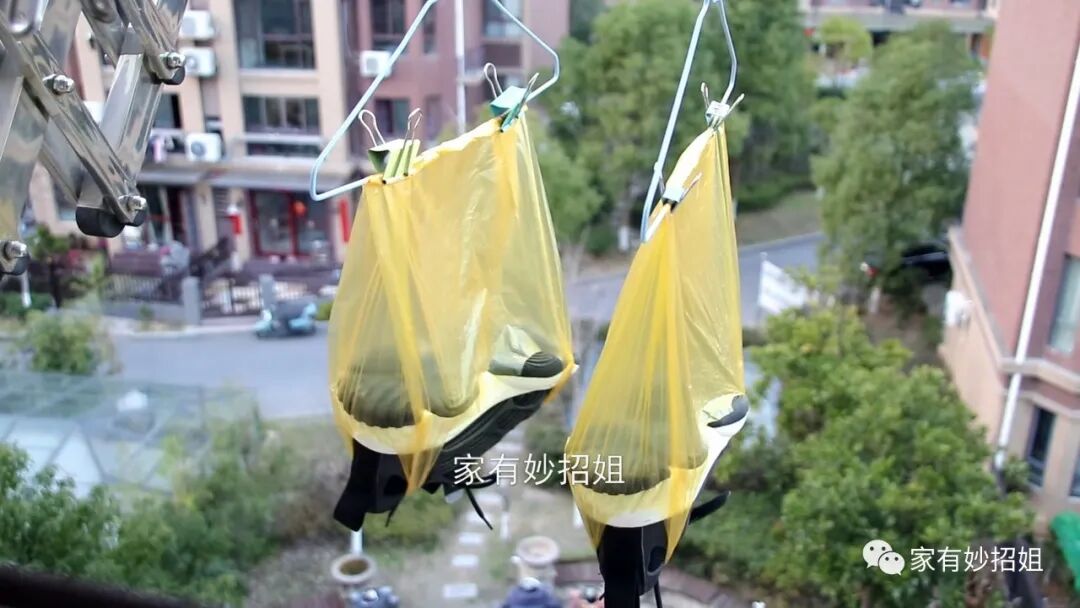 下面我们就可以用它来晒鞋子了,只需要将鞋子倒放着,穿进塑料袋的提手里面就可以。这样我们再拿去晾晒的时候,鞋子里面的水分都可以顺势流出来,我们的鞋子里就不会再有积水了,把它放到太阳下晾晒就能干的更快些了。如果今天的文章对您有帮助,那就点一个关注,点一个赞,感谢您的支持。