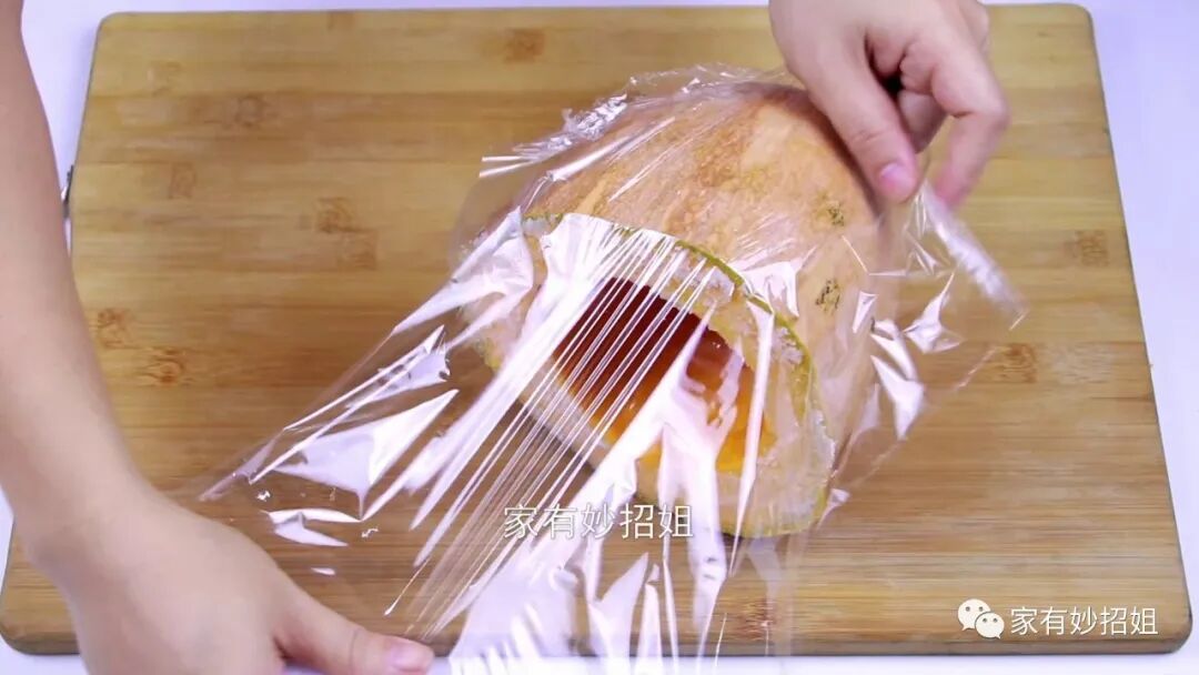 接下来,我们再准备保鲜膜,用保鲜膜将南瓜的切口处包裹起来。保鲜膜也能起到一个阻隔细菌侵入的作用,避免南瓜的切口接触到空气,这样也能延长南瓜的保存时间了。