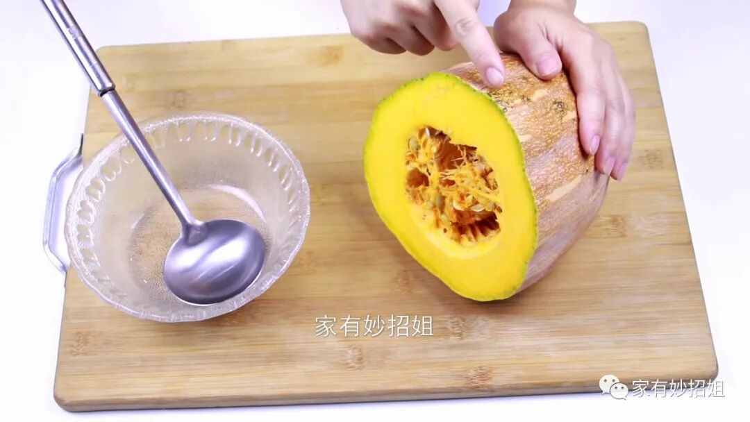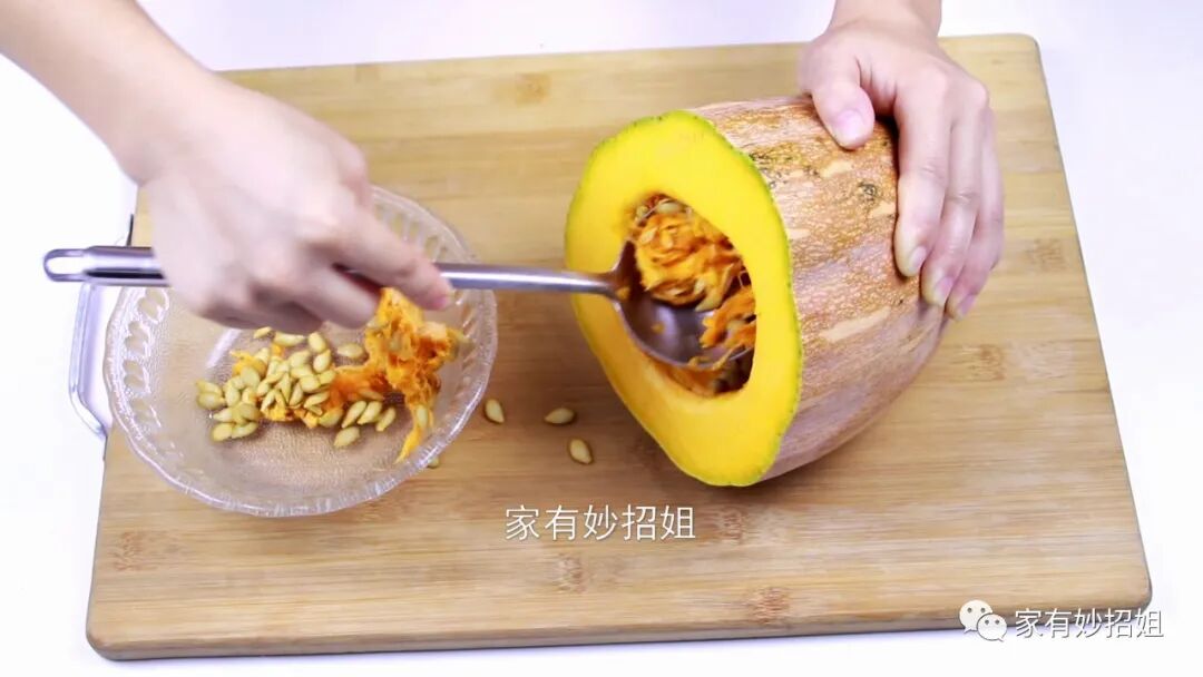 我们的南瓜切开后,在南瓜的内部会有瓜瓤、瓜子,而这些瓜瓤、瓜子含的水分比较多。水分一多,南瓜就容易发生腐烂。如果想要南瓜保存的更长时间,那么我们就需要先将瓜瓤跟瓜子挖出来。处理的方法很简单,我们只需要拿上一个汤勺,直接用汤勺将里面的瓜瓤、瓜子都挖出来就可以了,尽量挖干净一些。挖出来的南瓜籽我们也不要丢掉了,可以把它清洗干净,然后晾干水分,用来炒着吃也是非常美味的。