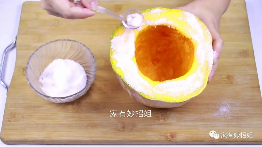 南瓜瓤挖好,我们再准备一点食盐,在南瓜的切口处均匀的涂抹上一层食盐。涂抹食盐的主要作用就是可以杀菌消毒,使南瓜的切口处在一个无菌的状态,这样就可以防止细菌侵入到南瓜的内部,使南瓜腐烂了。食盐我们可以稍微多涂抹一点,是不影响食用的。