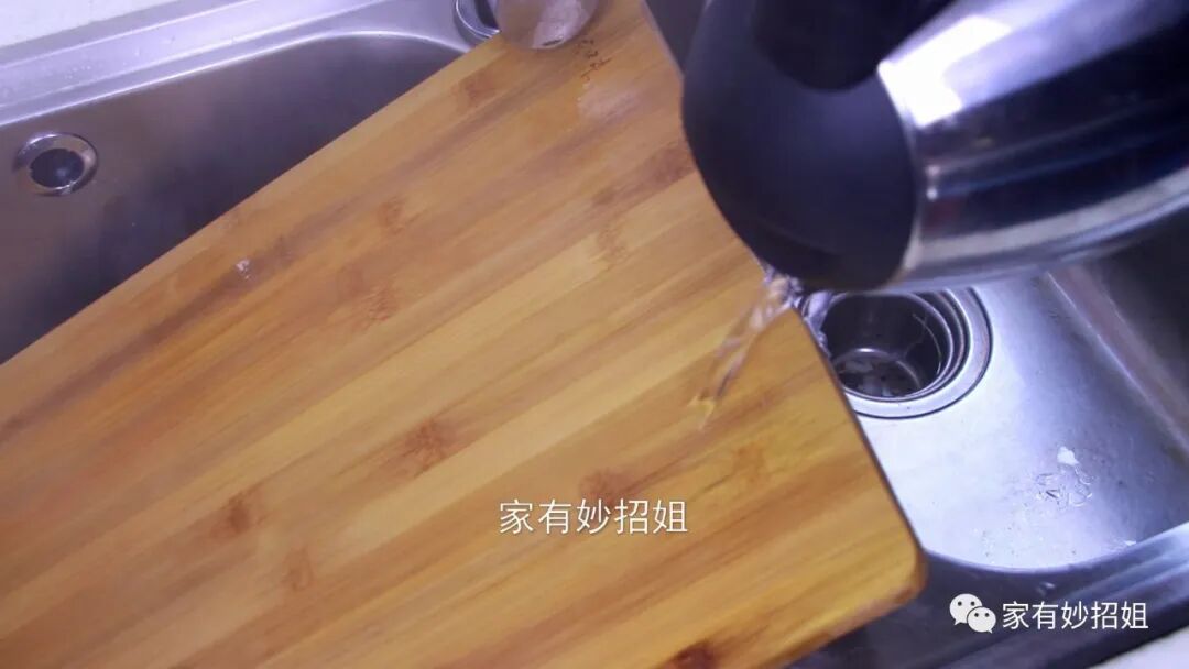 接下来我们把菜板立着,靠着水池的边缘,然后烧一壶开水,用开水把菜板烫一遍。开水的高温,不仅能将菜板上残留的细菌都消灭掉,而且开水挥发的非常快,可以使菜板快速变干。