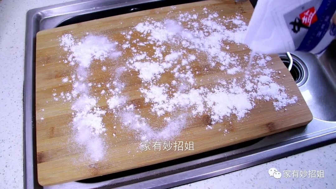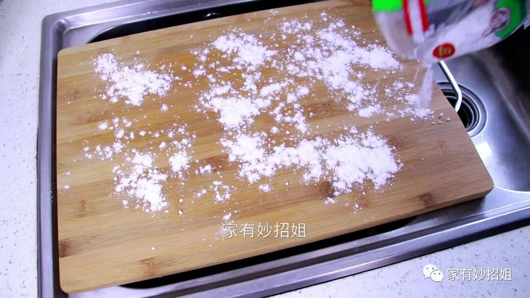 接着,我们再往菜板上倒一大勺食盐,食盐不仅可以用来调味,它还有杀菌消毒的作用。用它来清洁菜板,就可以将菜板上的细菌都消灭掉了,而且食盐是呈颗粒状的,还能增加摩擦力。