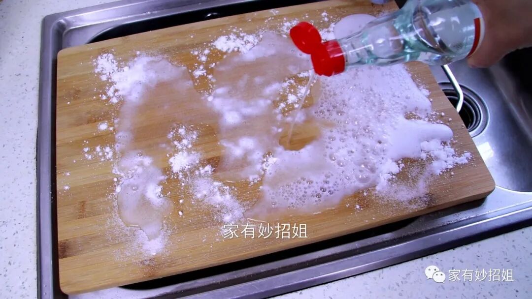 接下来,我们还需要往菜板上倒一点白醋,白醋也具有杀菌的作用,而且白醋还能软化菜板上的一些顽固污渍。白醋的醋酸味,也能去除菜板上的异味。