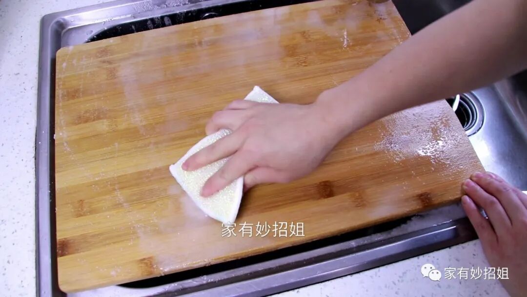 最后我们再拿一块百洁布,用百洁布粗糙的一面蘸取食盐、小苏打、白醋来擦拭菜板。将菜板的角角落落都反复的擦拭几遍后,我们就可以发现,菜板上的脏污都被清洁了出来。可能很多朋友觉得用钢丝球来擦菜板的话,会更加明显快速。但钢丝球会使菜板变得更加粗糙,这样下次使用的时候,还会更容易隐藏细菌,所以我们清洁菜板时最好不要用钢丝球。