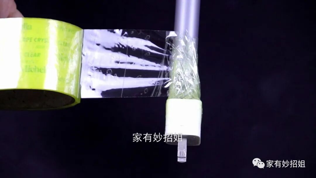妙用三:做一个撑衣架。首先我们拿一个废旧的拖把杆或者是扫把杆,然后再把充电头用胶带固定在杆子的一端。我们可以多缠绕一点胶布,尽量把它粘得牢固一点,那么这样一个撑衣架就完成了。