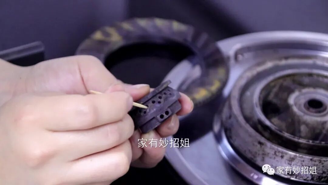 解决的方法很简单,我们只需要将这两个火盖取下来,用牙签将火盖上的小孔洞戳一戳,把里面的堵塞物都戳出来。