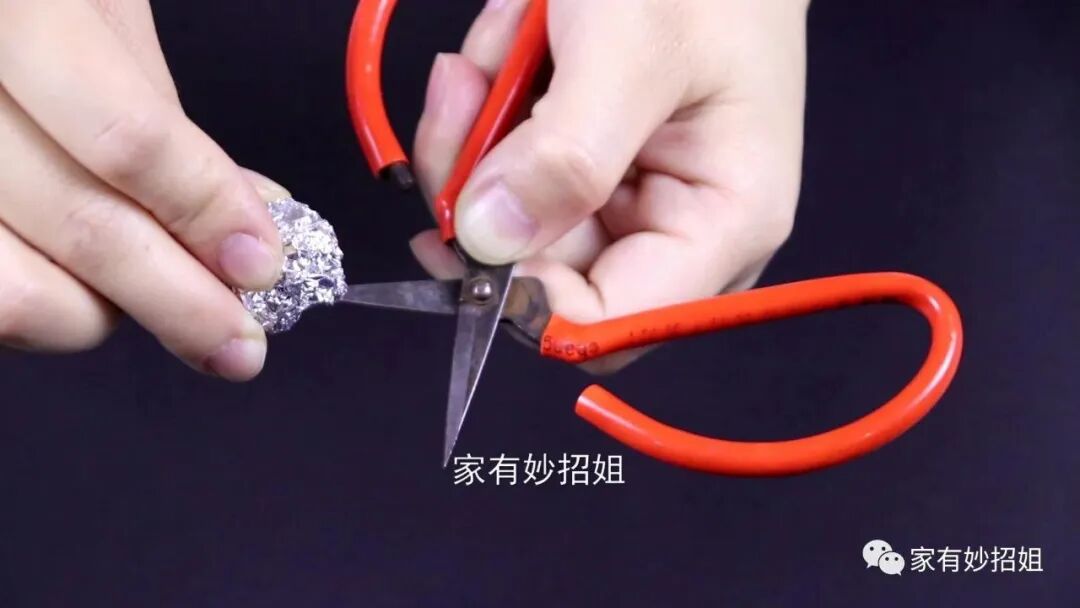 其实打磨剪刀不用磨刀石,也可以让剪刀变得锋利,方法也非常简单。在我们的剪刀表面,难免会有使用过程中留下的杂质,或者是一些锈迹。我们先要将剪刀表面的脏污处理掉,只需要准备一块锡箔纸,然后将锡箔纸捏成团。接着把这个锡箔纸在剪刀的表面摩擦几下。捏成一团的锡箔纸表面非常的粗糙,我们用它在剪刀表面摩擦,就可以将上面的锈迹、污渍都处理干净了。