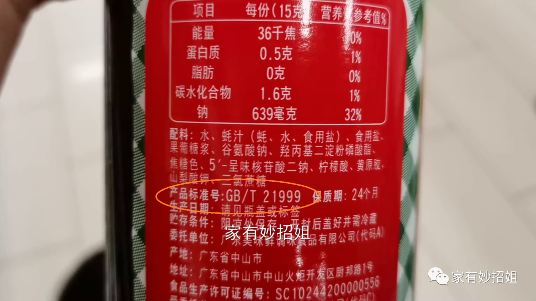 我们除了要看清配料表中的蚝汁成分后,还需要看一下瓶身上标注的产品标准号。我们不管购买什么物品,在物品的包装上都会有生产标准号,蚝油的标准号一般都是GB/T开头的GB,也就是国标的缩写,而T21999是推荐的意思,那这就说明这瓶蚝油是按照国家生产标准要求生产的,我们是可以放心选购和使用的。那如果这个标准号是其他字母开头,这样的蚝油,就建议大家不要购买和使用了。