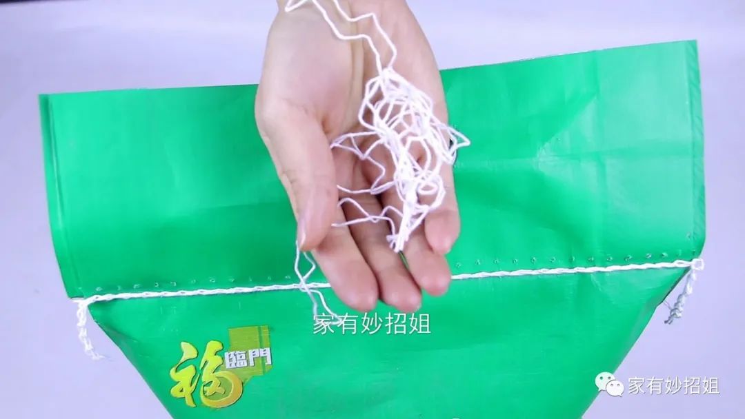 接下来,我们就可以一手抓住一根线,然后往两边一扯,这样封口线就被拆开了,还能一拉到底,非常简单快速地就把封口线拆下来了,这样我们的米袋就拆开了。