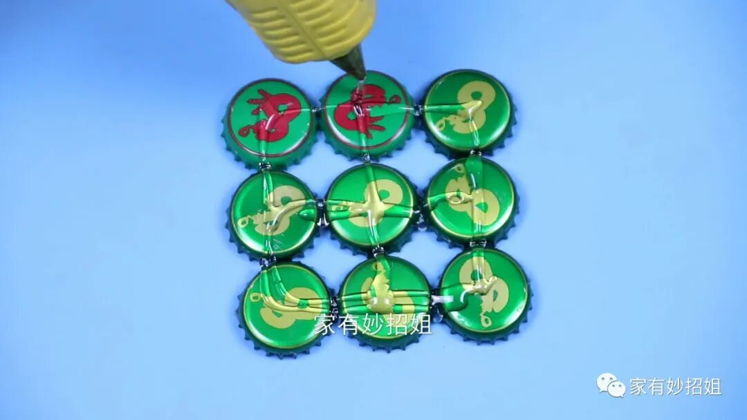 其实啤酒瓶盖除了可以用来刮鱼鳞,我们还可以将它制作成一个蚊香架。现在气温慢慢升高了,天气一热就会有蚊虫出没,而蚊香就是我们常用的一种驱蚊物品,要是家里没有蚊香架的话,我们就可以用啤酒瓶盖改造一个。方法也很简单,我们先准备九个啤酒瓶盖,然后把瓶盖三个一排的排成一个正方形,将瓶盖的平面朝上。接着我们在瓶盖上打上一点热熔胶,使瓶盖之间都能牢牢的固定在一起。