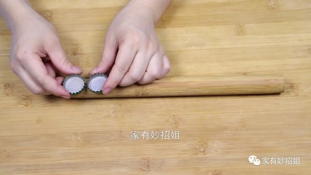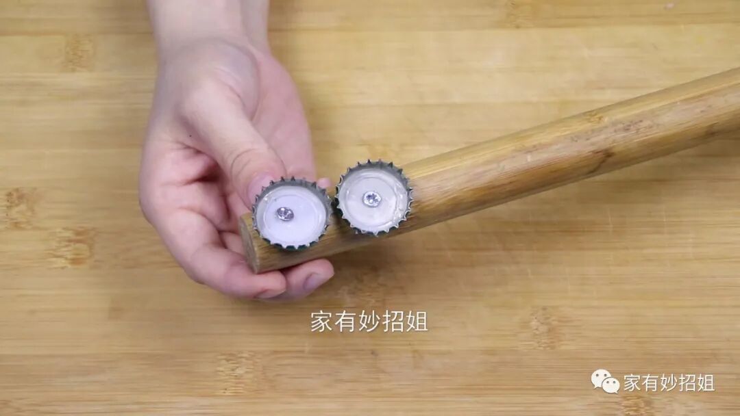 接着再准备两个啤酒瓶盖,现在的天气慢慢变热了,天气一热,在吃饭时很多朋友就会喝上两瓶啤酒。喝完的啤酒瓶盖我们不要扔掉了,可以将它收集起来。然后再准备两个钉子,用钉子把啤酒瓶盖固定在擀面杖的一端。两个啤酒瓶盖之间不要分的太开,并排固定在擀面杖的一端就可以了。