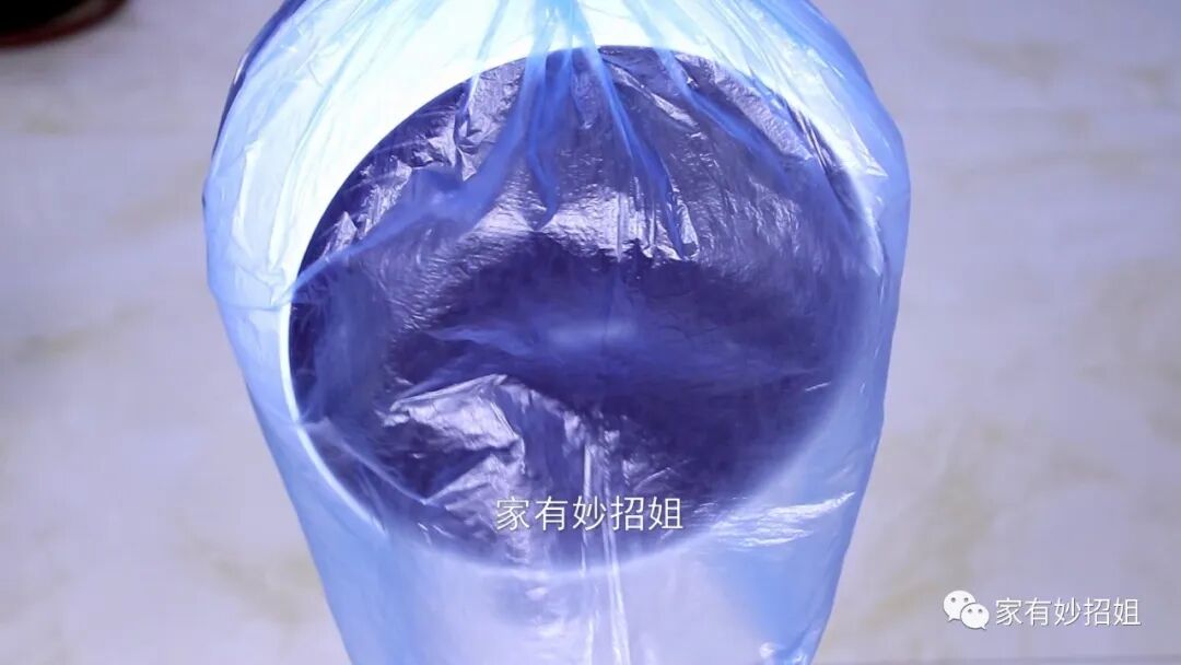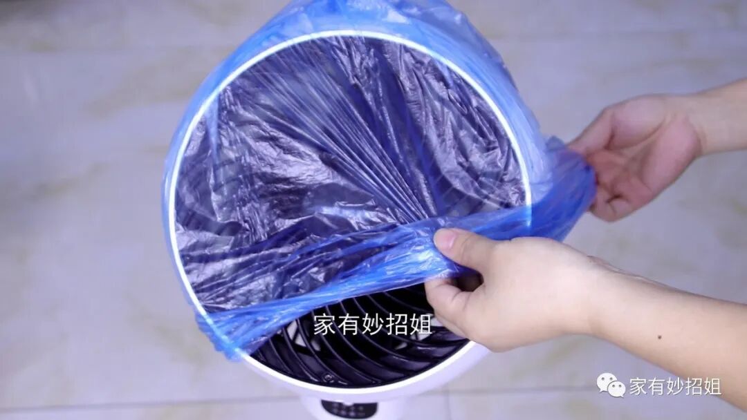 接下来,我们再将电风扇通上电,按开关,让电风扇转动两分钟。电风扇在运作的过程中,就会将扇叶上的污渍给甩下来,而我们套上了一个塑料袋,甩下来的脏污也不会弄得到处都是,都甩在了塑料袋里面。