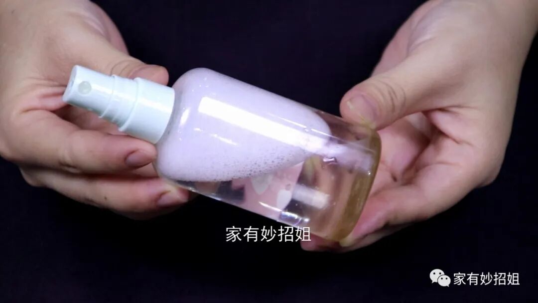 接下来,我们再往喷壶里接入大半壶清水,然后将盖子盖紧,摇晃一下,使里面的物品充分的溶解在水中,这样一个清洁电风扇的溶液就制作完成了。
