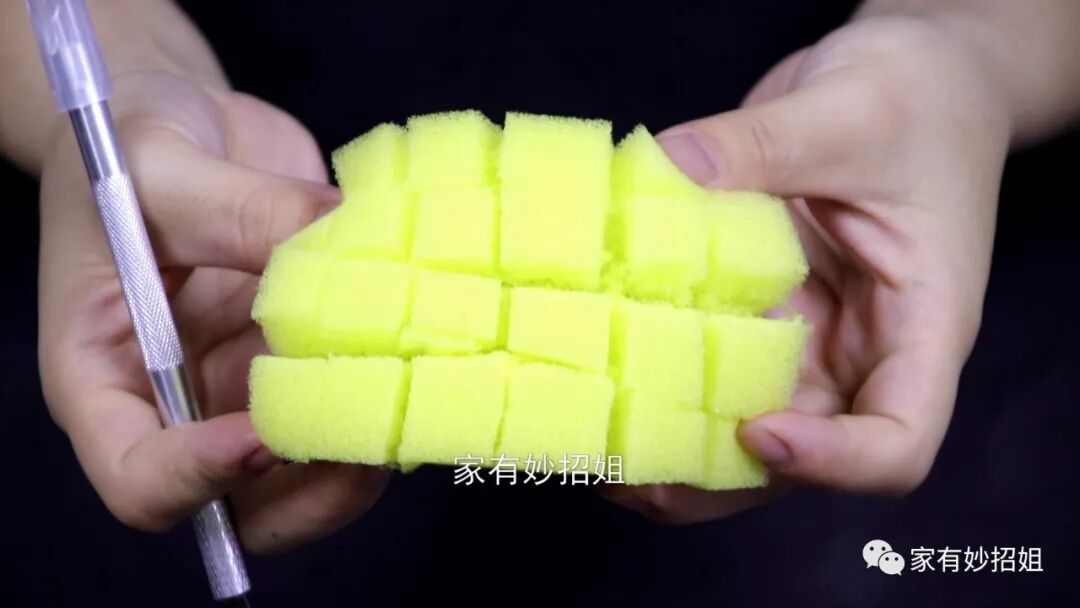扇叶清洁干净了,但风扇外面的网罩上还会有很多的脏东西,尤其是一些小缝隙里面,很难擦拭的到。遇到这个问题,我们就可以利用上一块百洁布,只需要将百洁布柔软的一面横着切几刀,再竖着切几刀,这样百洁布就变成了很多的小正方形。